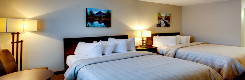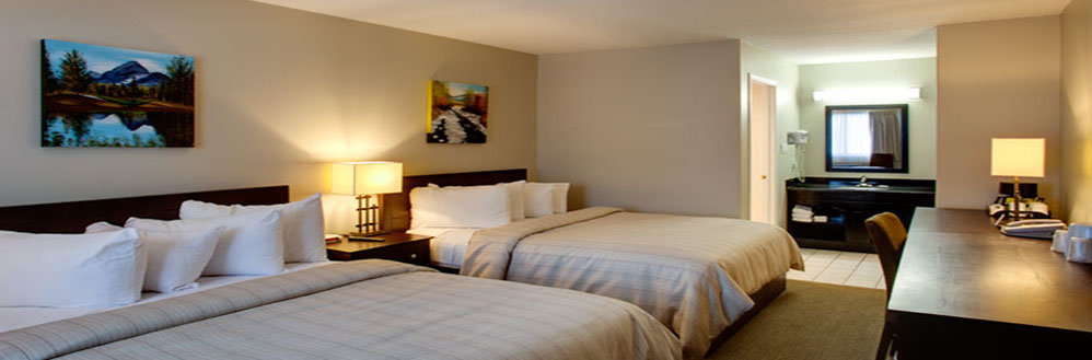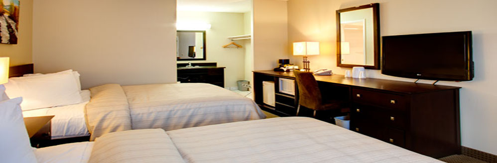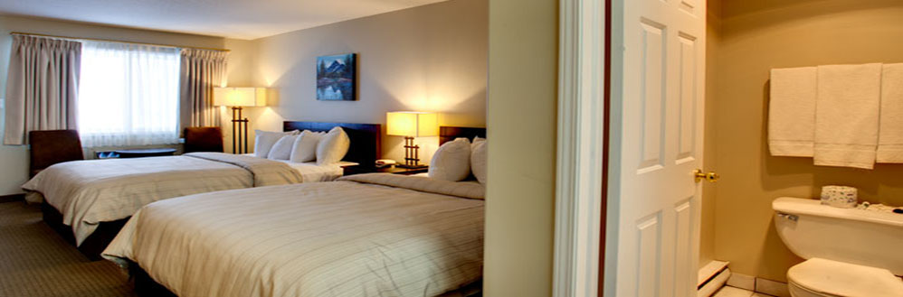 Bedrooms with two queen beds. Private bathroom. Room has TV, fridge, microwave and a coffee maker.